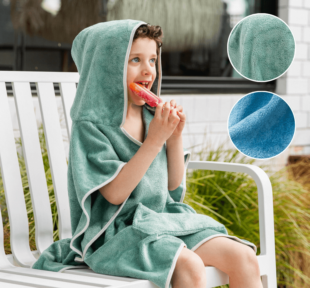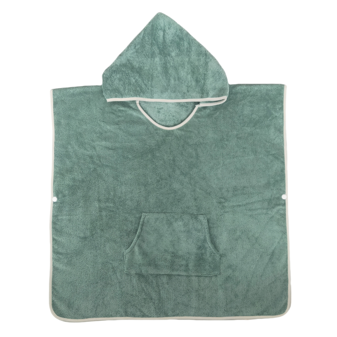 Designed with comfortable hood and front pocket for extra cosiness. Available in Sage with Ecru Piping (featured) as well as Kids Hooded Poncho in Teal.