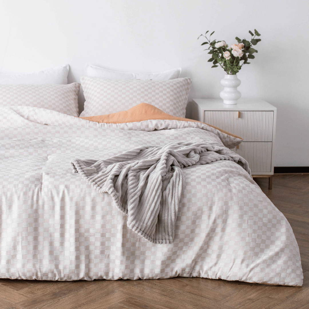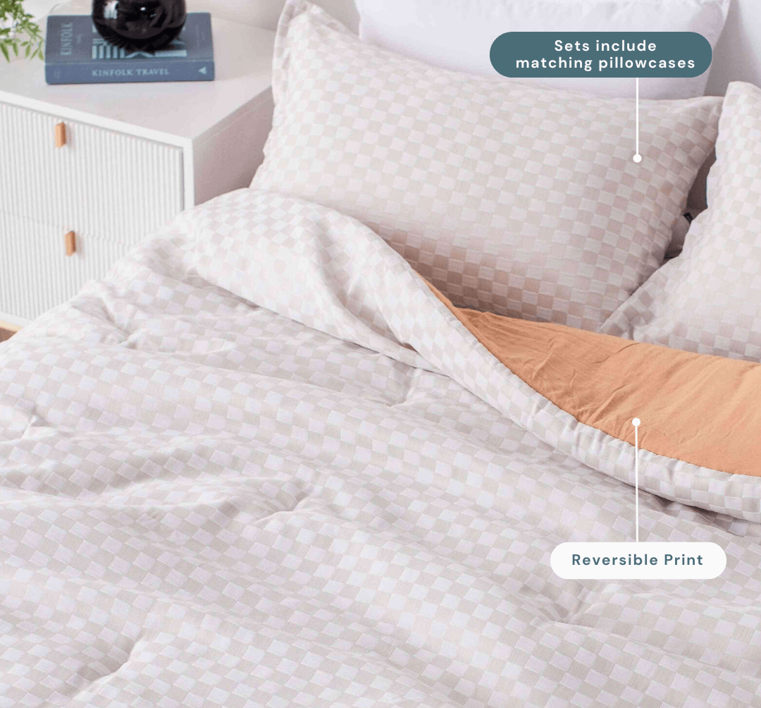 Our new lightweight and hypoallergenic Carlisle Quilted Comforter Set gives you the option of modern clean check print or a warm stylish sand on the reverse side.With extra quilting, use it as a heavier-weight top-layer through Winter, or on it's own a single layer for Summer's hottest nights.