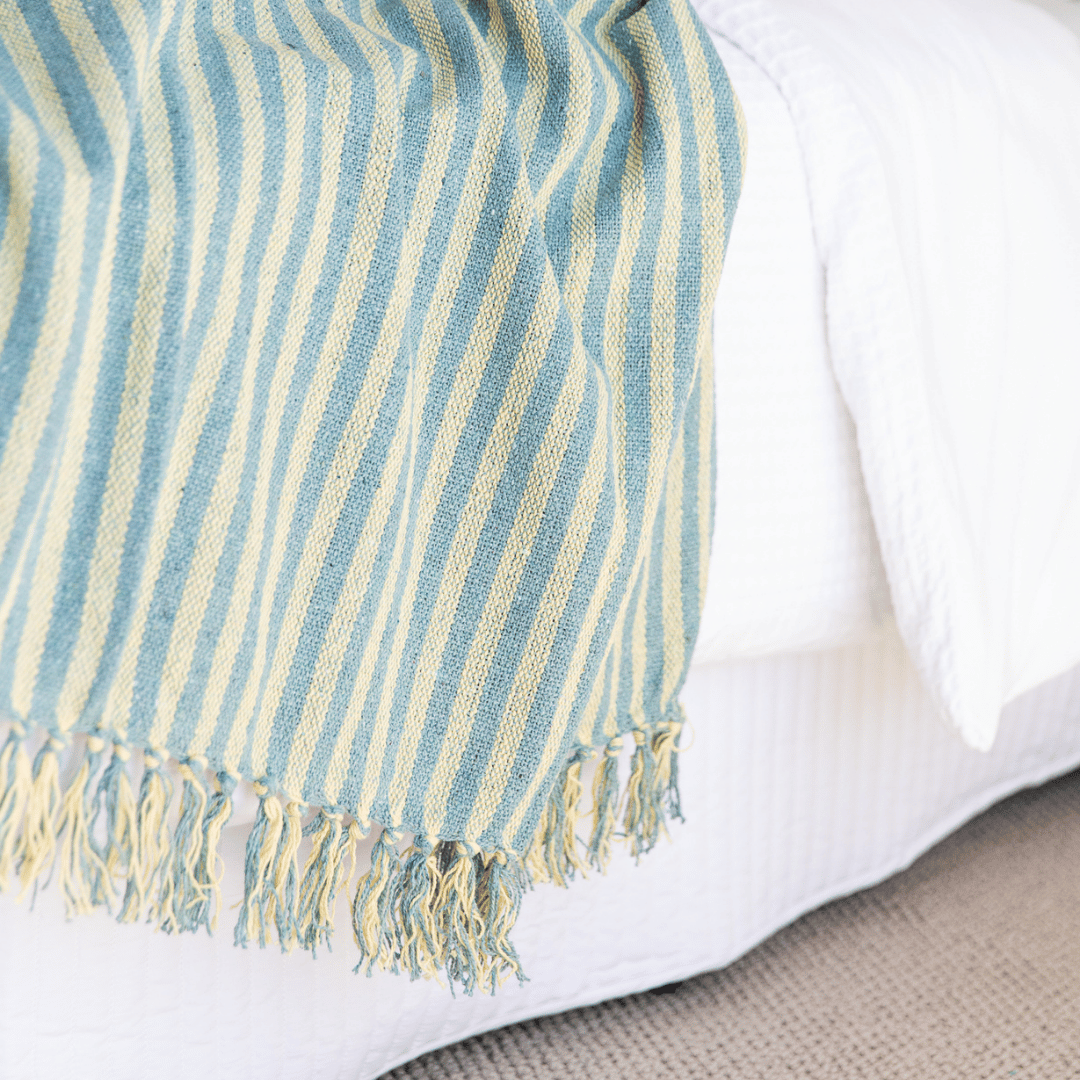 The New Cosy Spring/Summer Essential, the lovely, soft Somers Stripe Cotton Throw. Perfect addition to the end of your bed for a light layer when the nights are cool, or a cosy companion on the couch. Sourced from 100% Recycled Cotton as part of our ongoing commitment to sustainable products for Australian homes. Gorgeous Somers Stripe Cotton Throw is in a Marine Blue / Green contrasted with Soft Yellow Stripes.