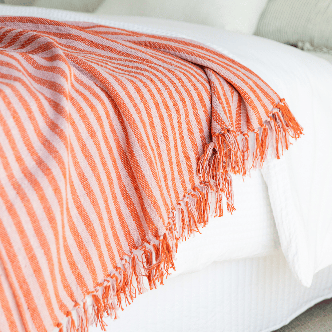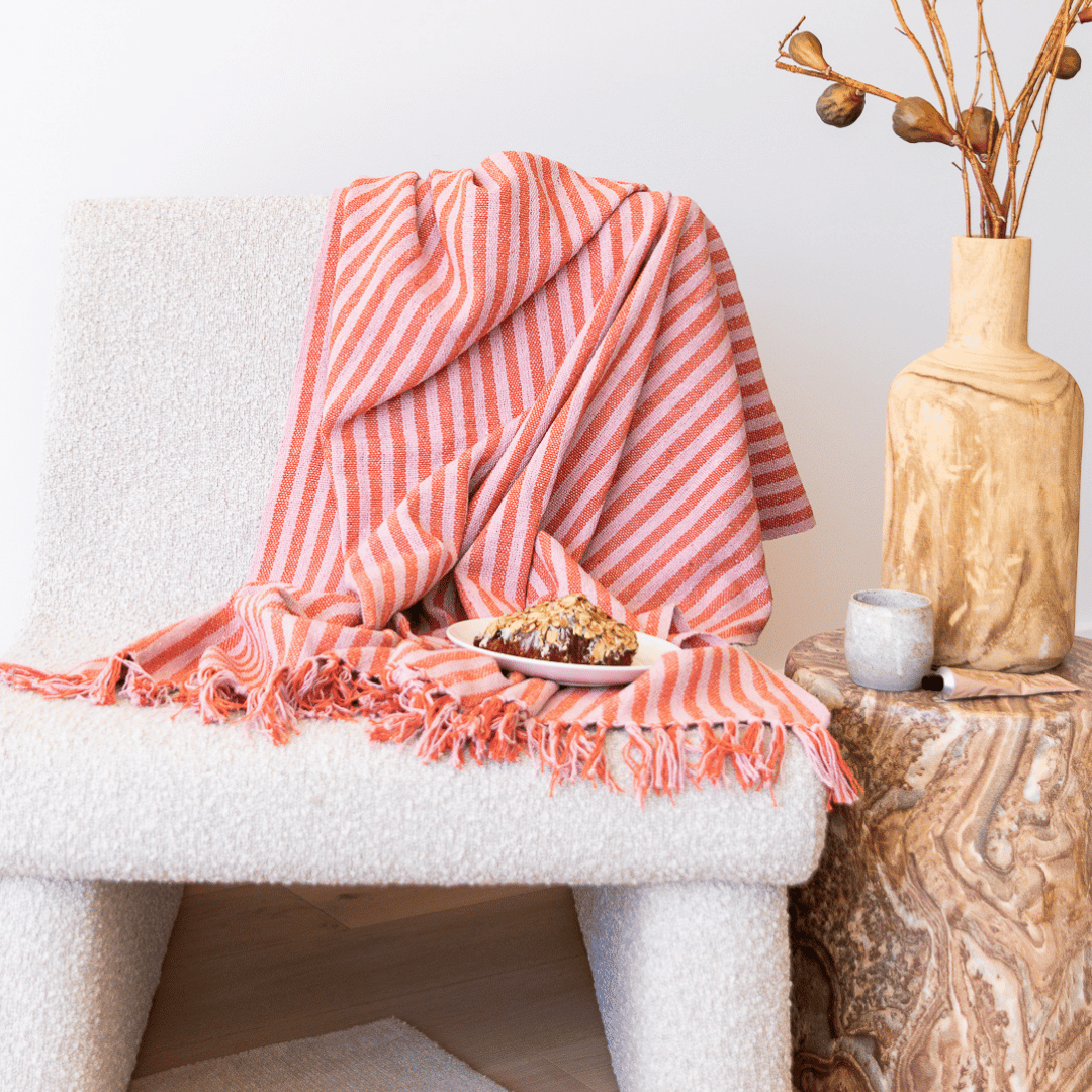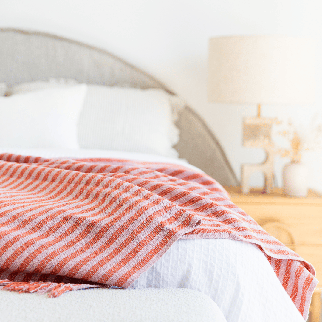 The New Cosy Spring/Summer Essential, the lovely and soft Somers Stripe Cotton Throw. Perfect addition to the end of your bed for a light layer when the nights are cool, or a cosy companion on the couch. Sourced from 100% Recycled Cotton as part of our ongoing commitment to sustainable products for Australian homes. Gorgeous Somers Stripe Cotton Throw is in a Soft Pink and Burnt Orange Tones.