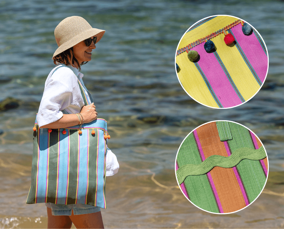 Our range of Beach Bags comes in a variety of sizes, featuring playful design details with bold stripes, pom pom trims, tassels and wave embroidery.