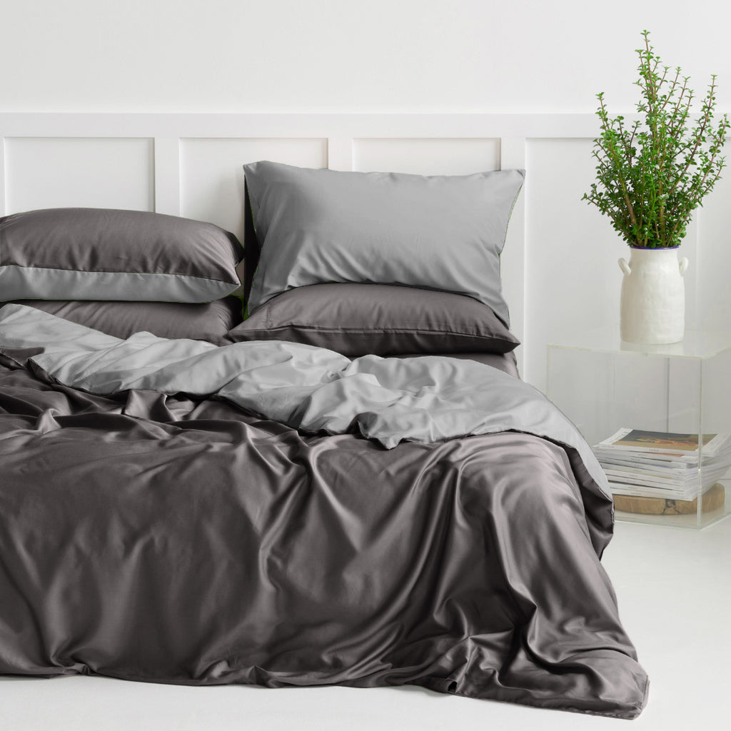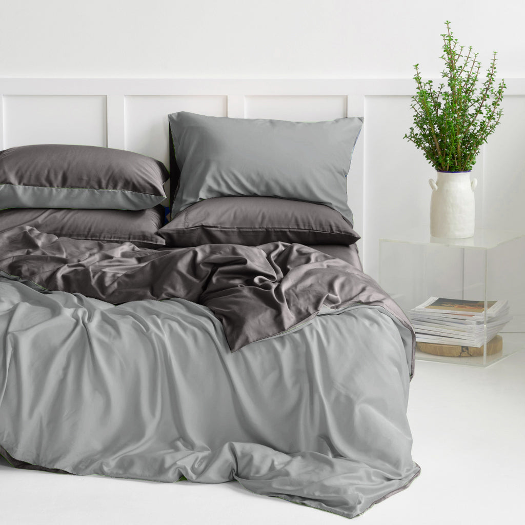 Available in Silver Quilt Cover Set with Graphite as its reverse.