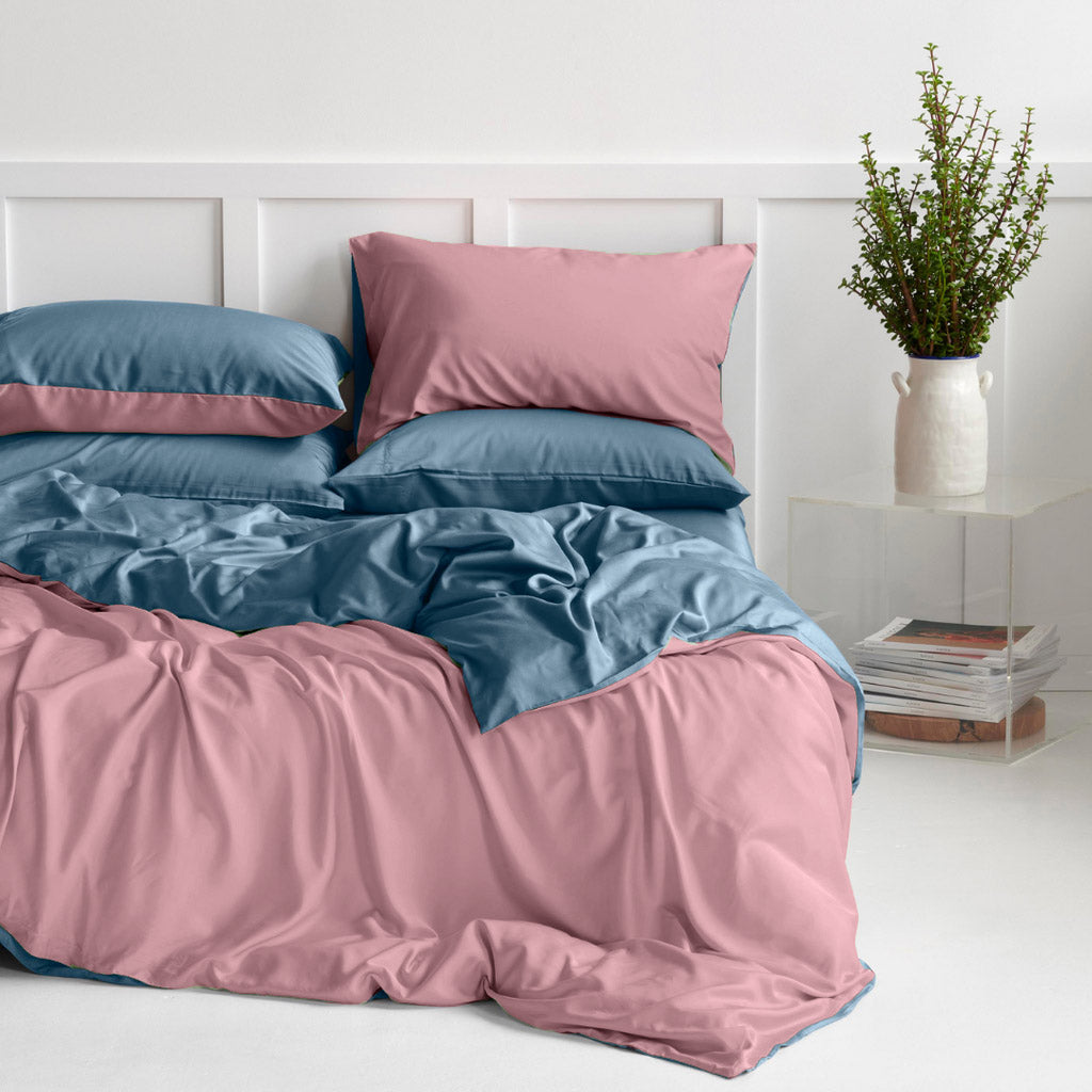 Available in Blue Mirage Quilt Cover Set with Dusty Pink as its reverse.