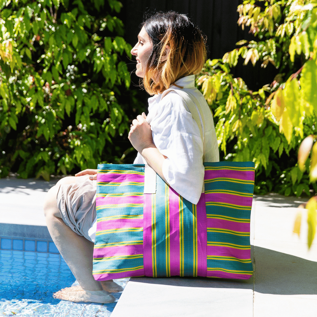 This Summers hottest new beach accessory in a new colourway, the Large Beach Carry All Bag. Designed for the Australian Summer - this is our largest of the beach bags. This Carry All Bag is Sand-Free featuring vibrant colours - a combination of coloured stripes with a decorative pom-pom trimming to take it to the next level. Perfect size to hold all your Beach or Poolside essentials.
