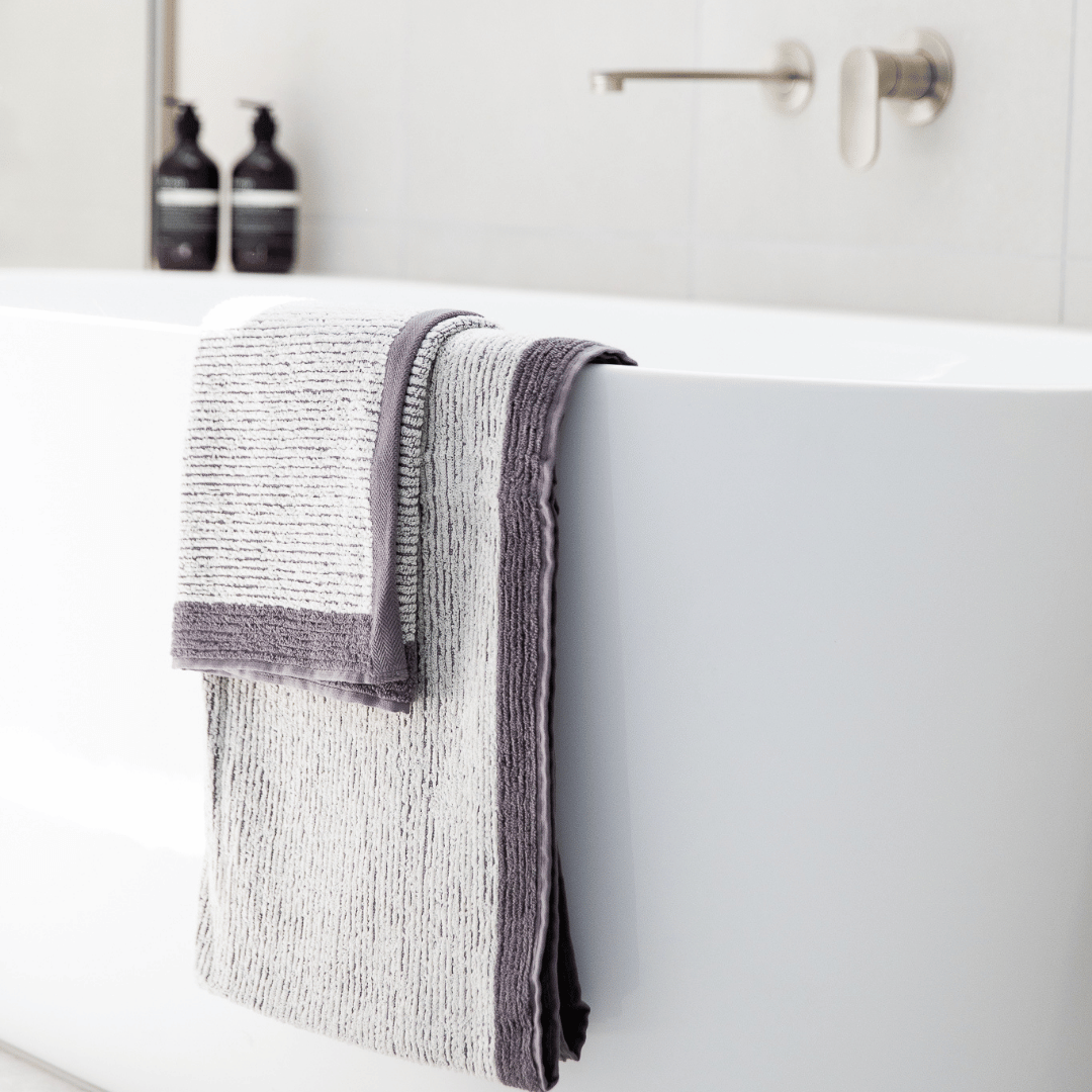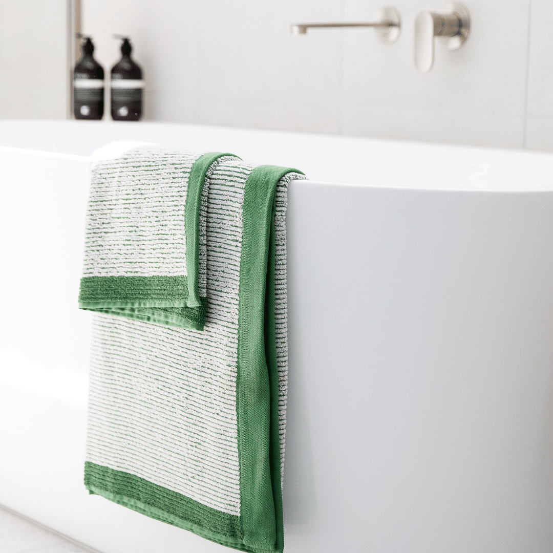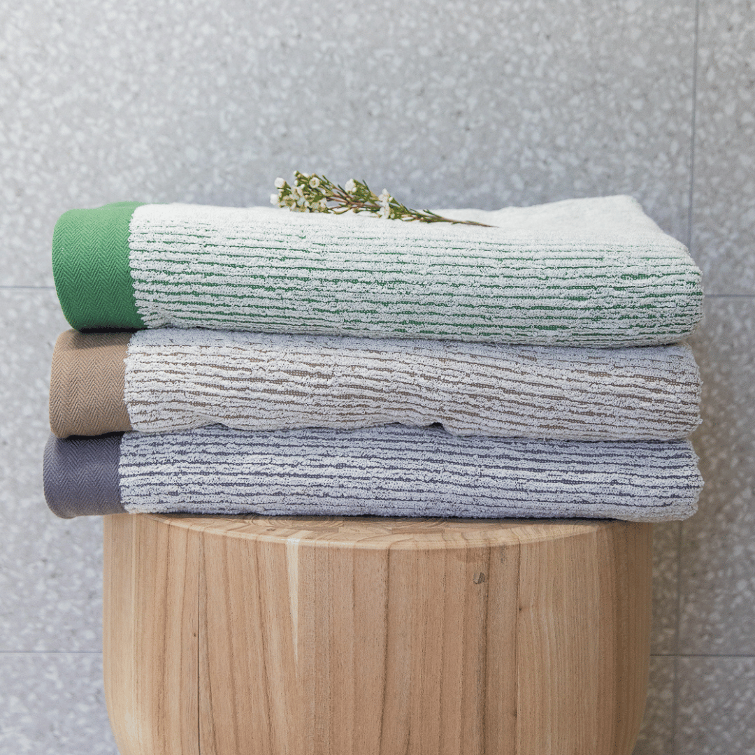 The new season modern Broadway Yarn-Dyed Cotton Towels are luxuriously soft to touch and highly absorbent, defined with a Low Twist Weave to achieve a premium finish with a bold block colour border around all 4 sides of towel.