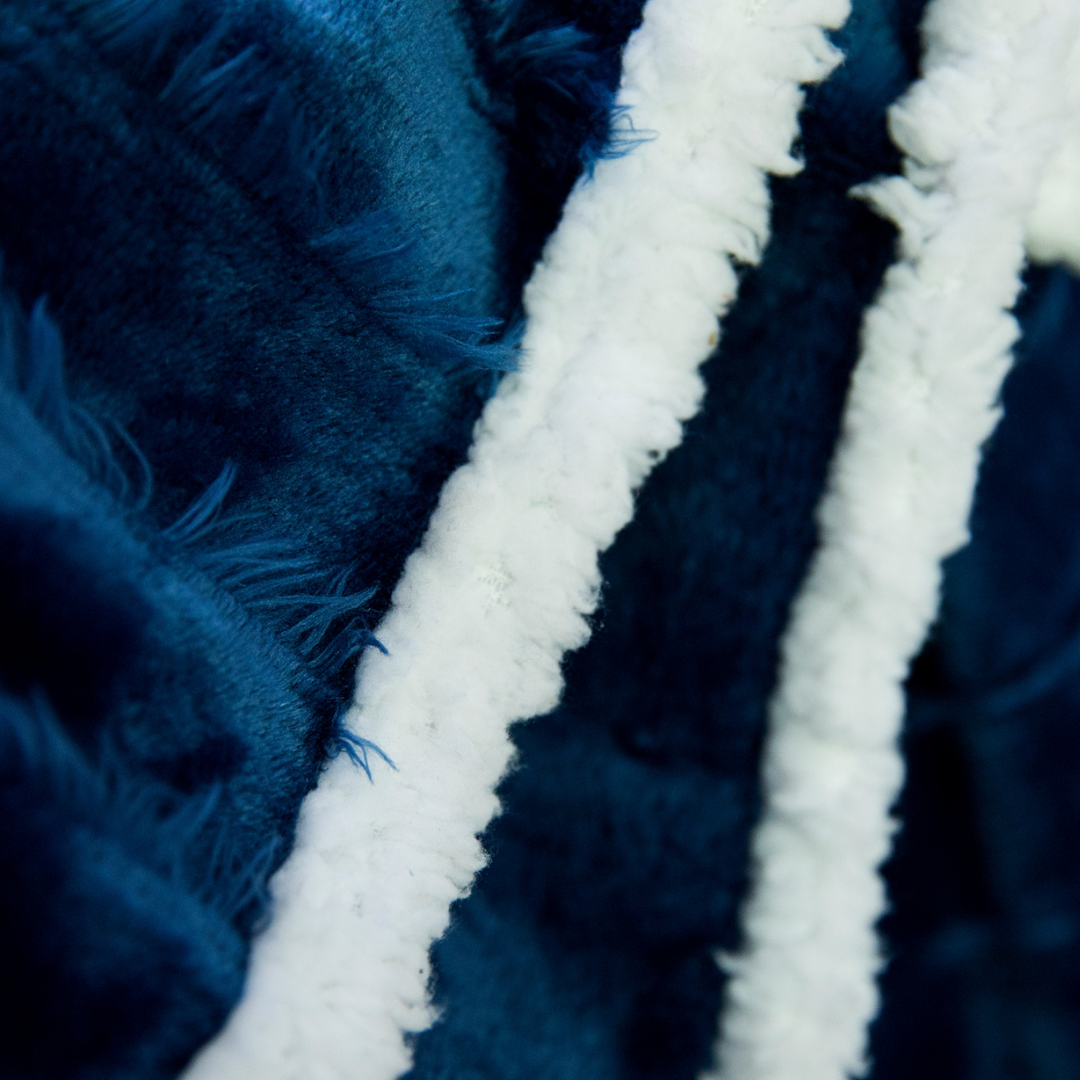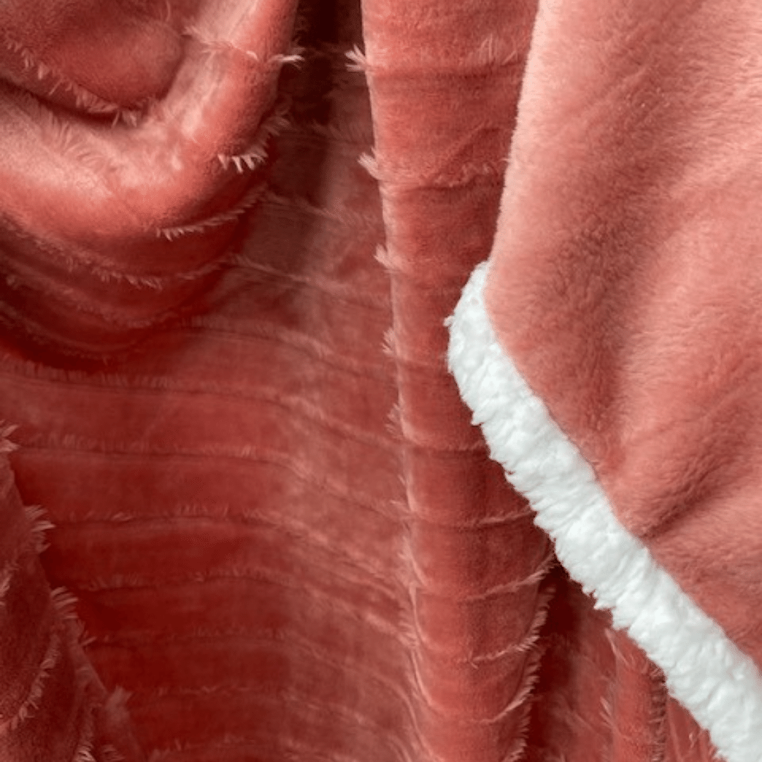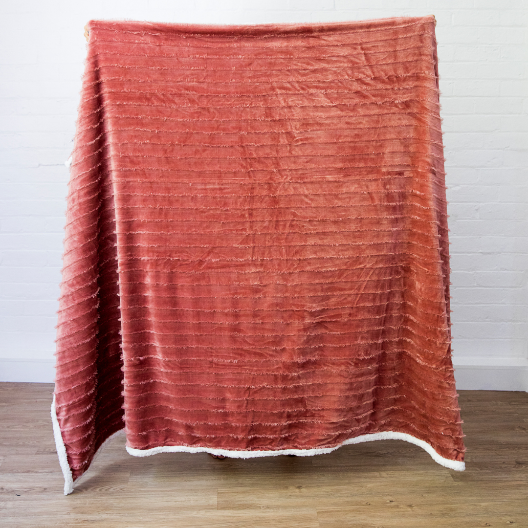 The Stella Blanket features a vertical Fringed Stripe along the length of the Blanket and a stylish White Teddy Fleece border with plain same colour reverse.